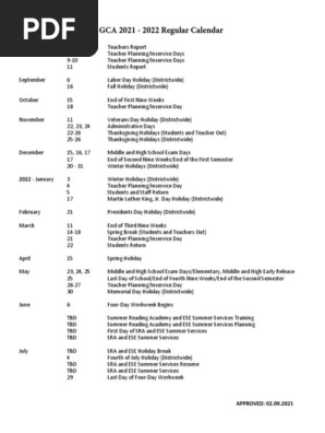 GCA In-Person and Virtual. GCA is a private K-12 Christian school in Frisco TX. GCA 2021-2022 REGULAR CALENDAR. 2021-2022 School Calendar PDF.